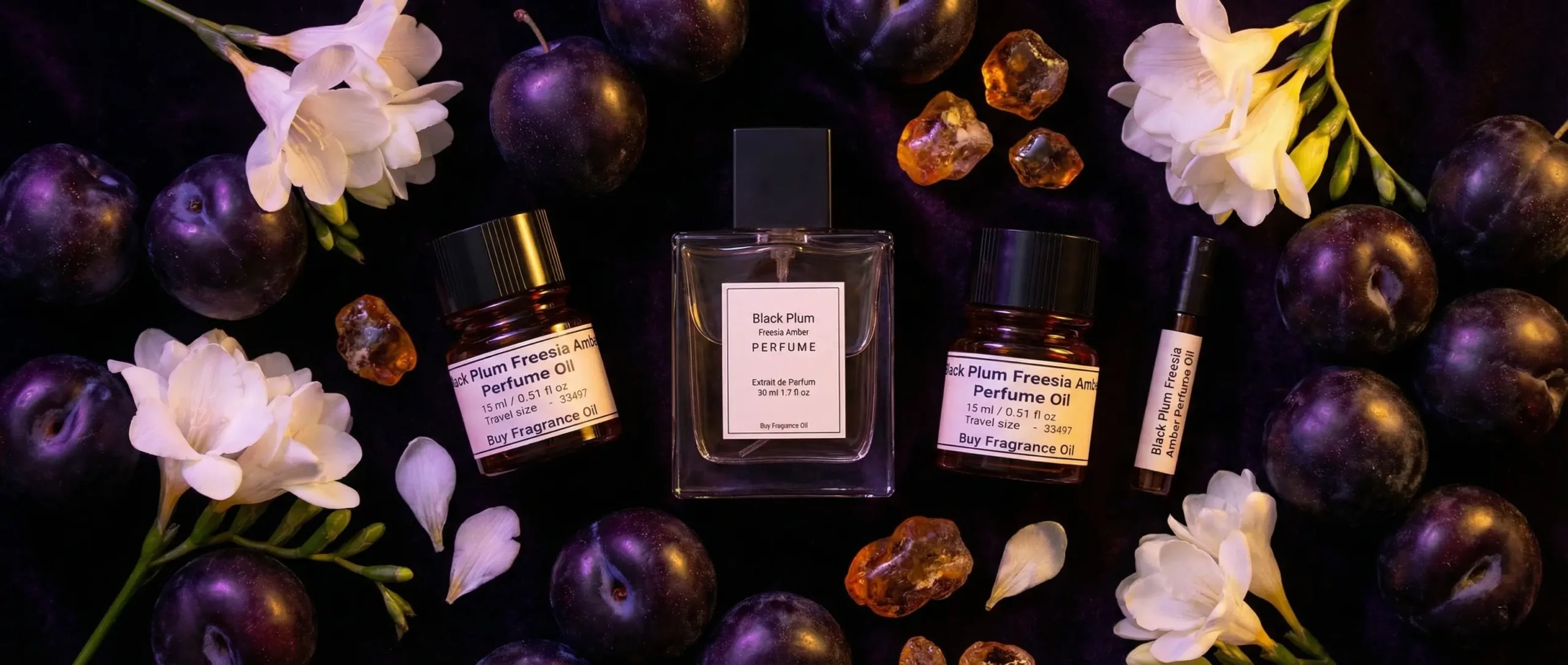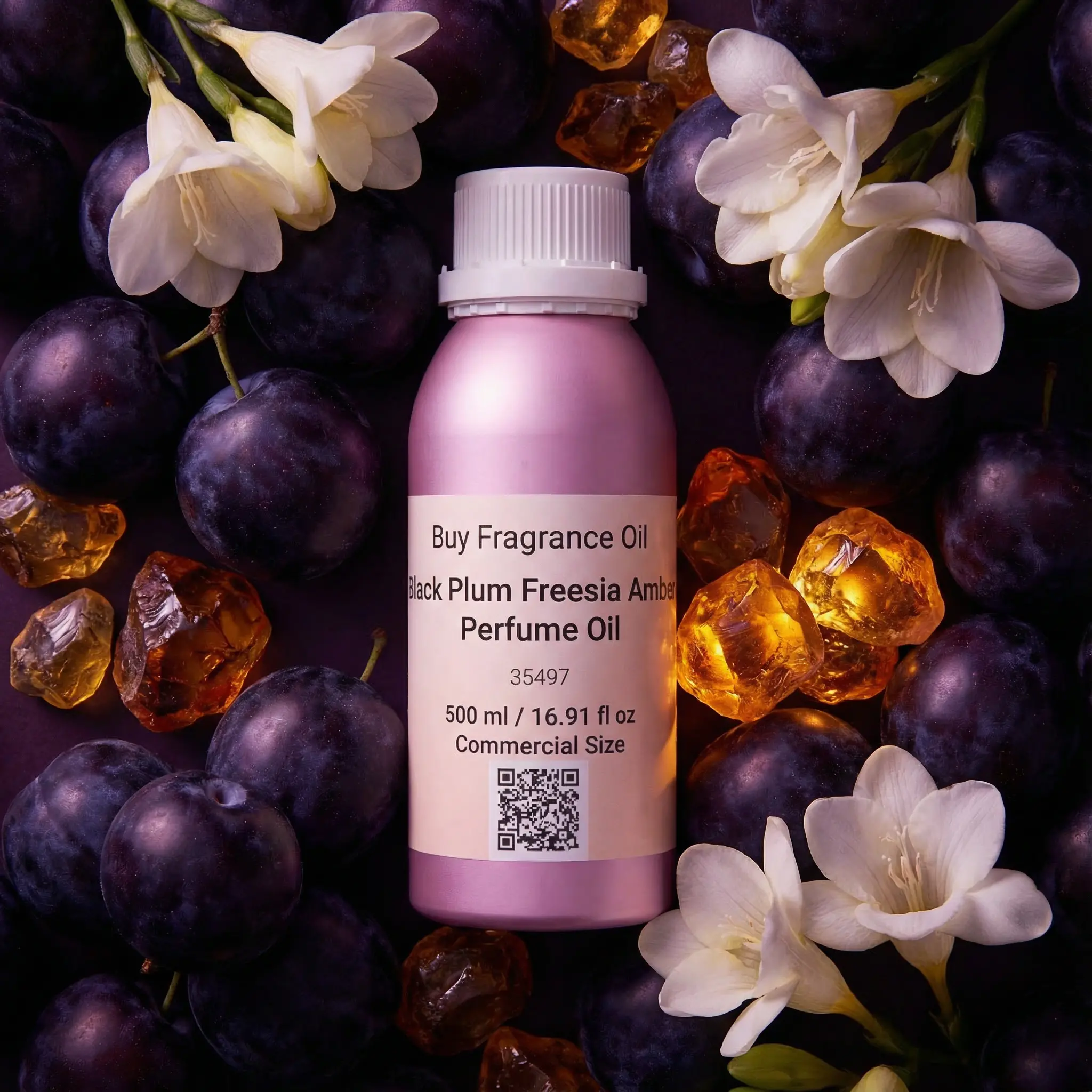 Black Plum Freesia Amber Perfume Oil blends juicy dark plum, soft freesia, and warm amber.