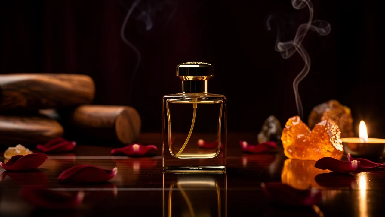 A royal oud and rose embrace, wrapped in golden amber warmth.
