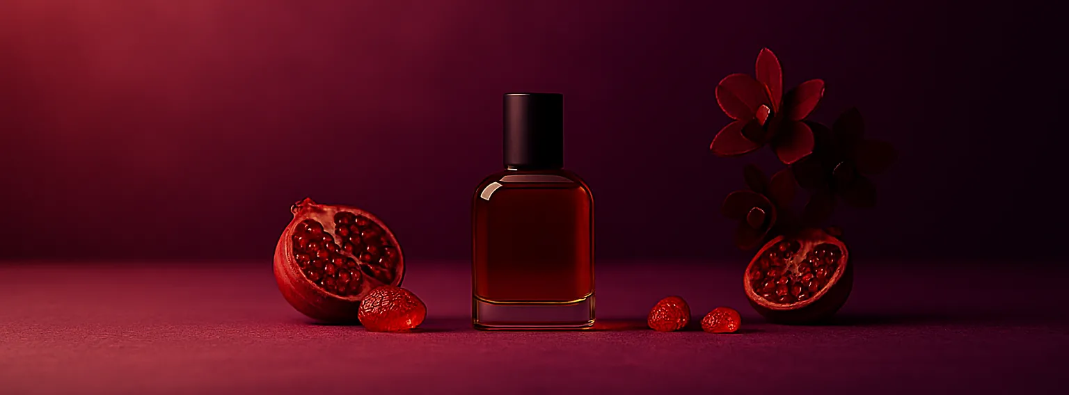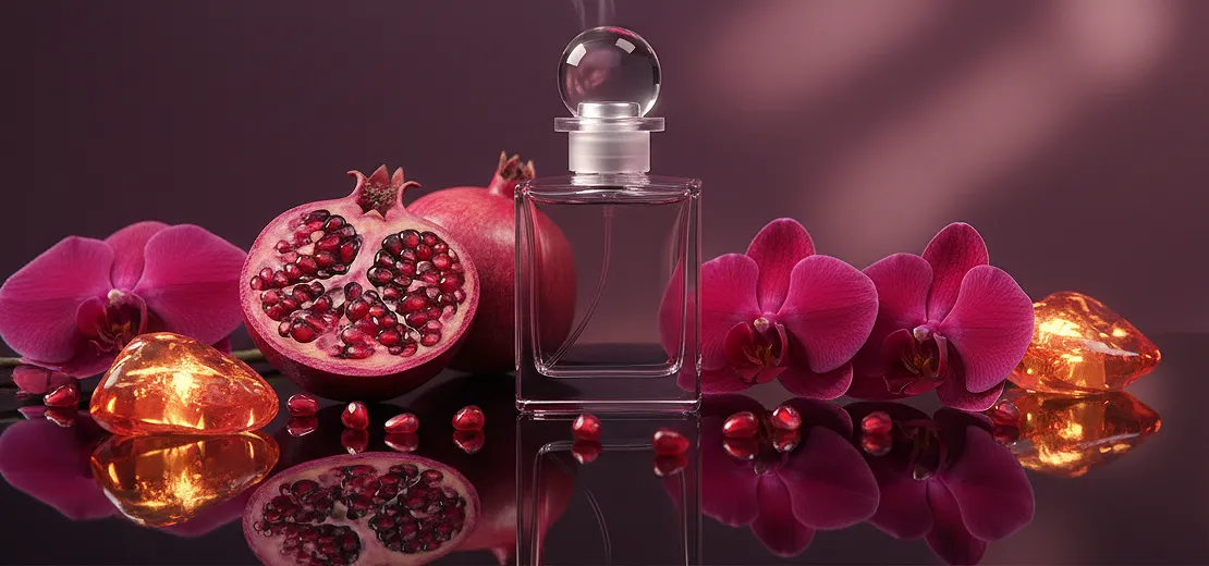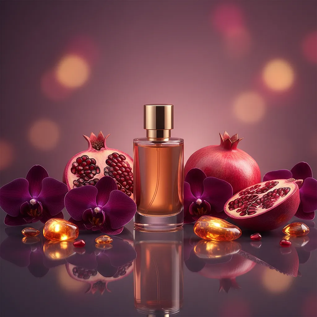 An exotic dance of pomegranate and orchid wrapped in amber — mysterious, confident, and captivatingly bold.