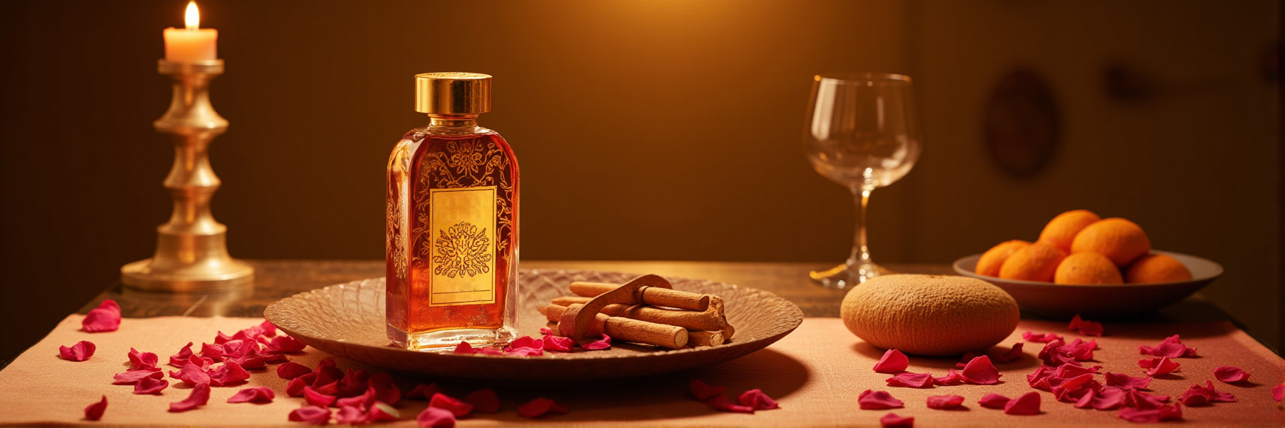 Indian attar and traditional perfume oils with rose petals, sandalwood, and ornate glass bottles in a luxurious setting.